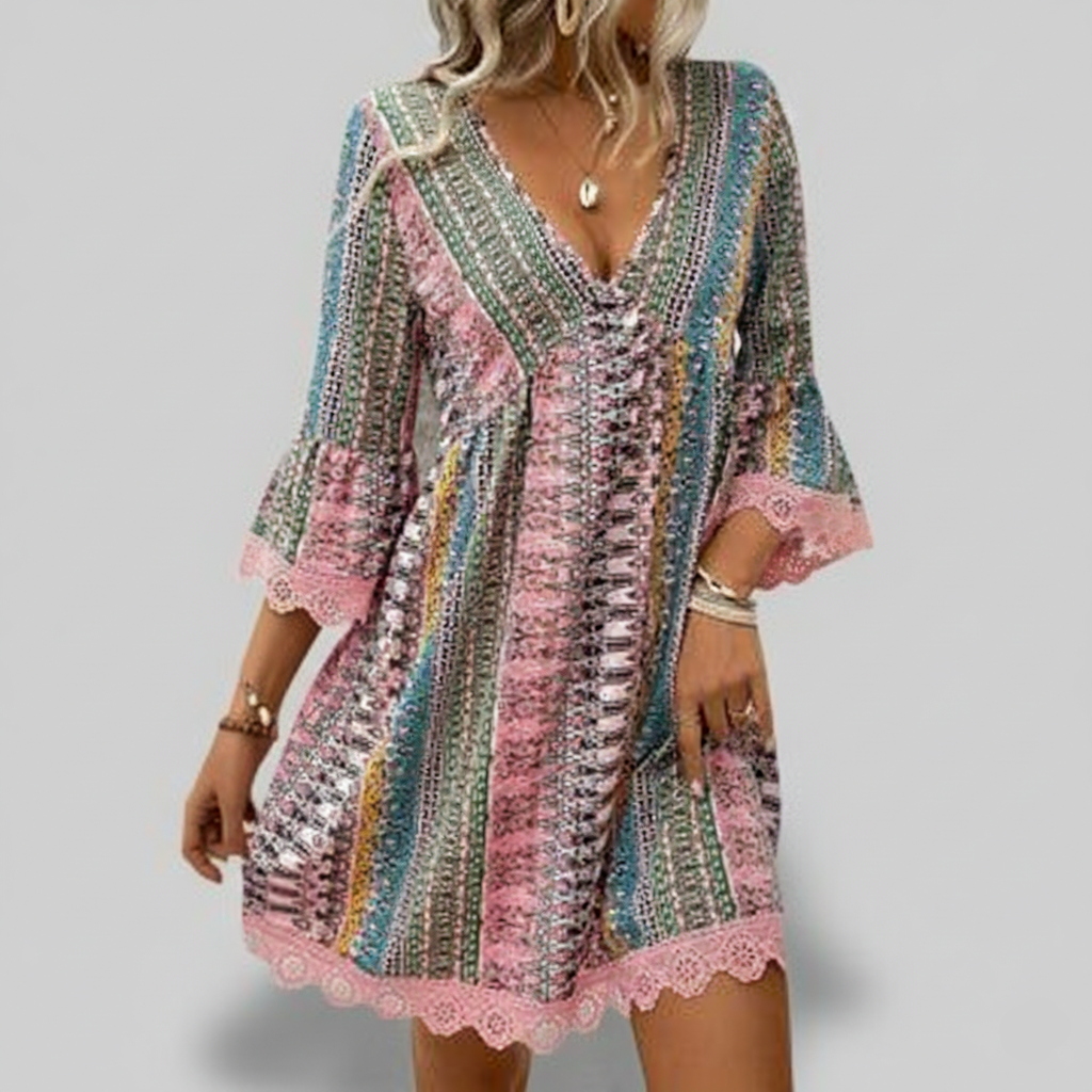 Stacey – Mini šaty s boho potiskem jsou ideálním společníkem pro letní dny plné lehkosti a svobody. Díky vzdušnému střihu a jemnému materiálu vám poskytnou maximální pohodlí, zatímco výrazný boho vzor dodá každému outfitu jedinečný šmrnc. Perfektní volba na dovolenou, do města i na volný čas.