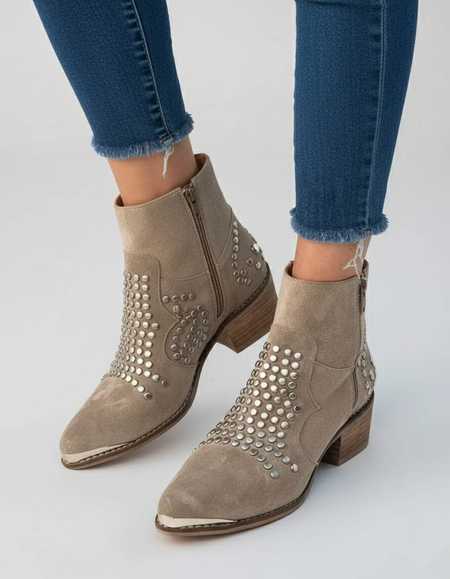 Kotníkové boty Zoya v boho stylu kombinují měkký semiš s výraznými kovovými cvočky. Moderní a zároveň nadčasový design, který podtrhne každý outfit – od džínů až po ležérní šaty.